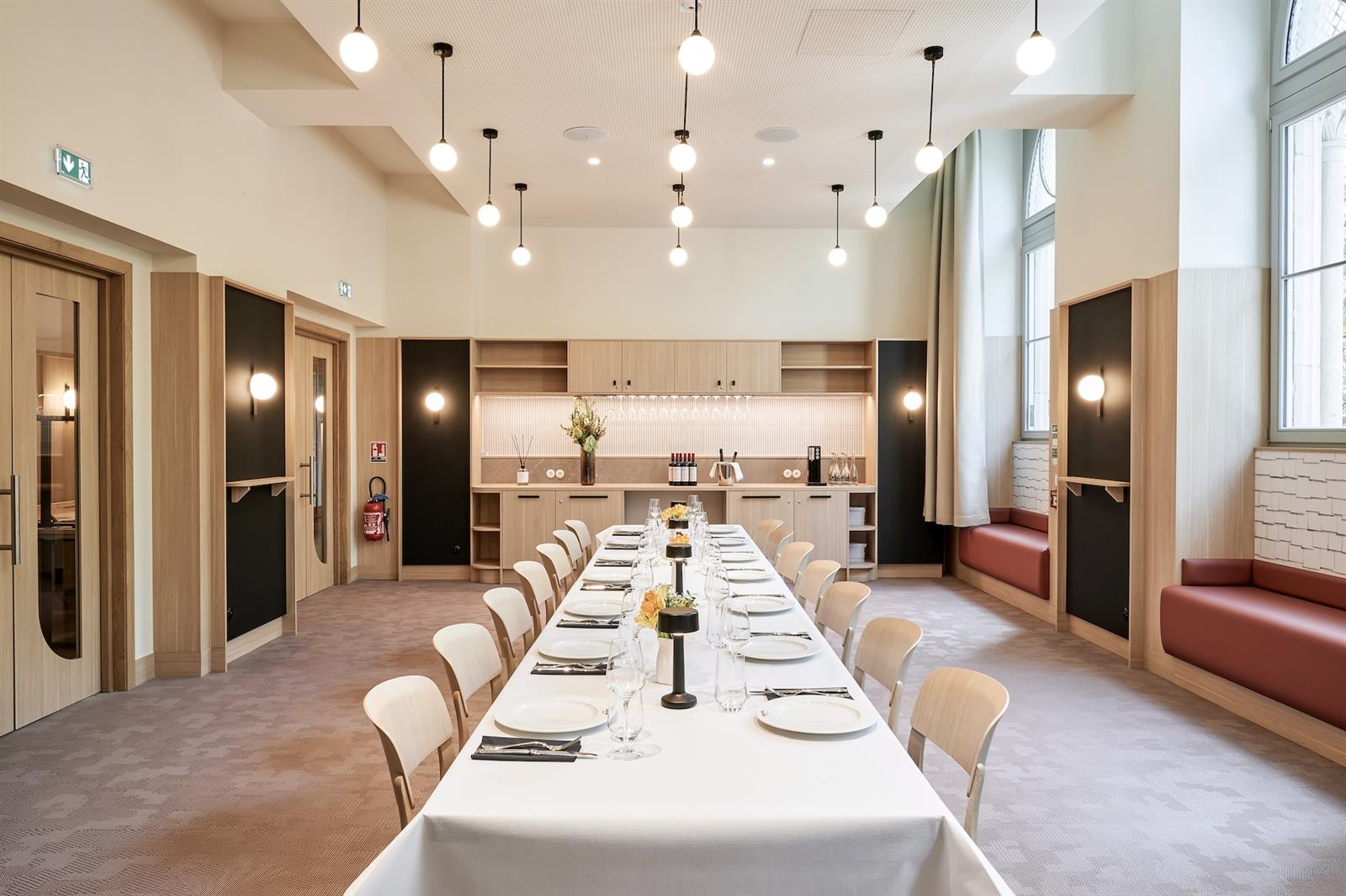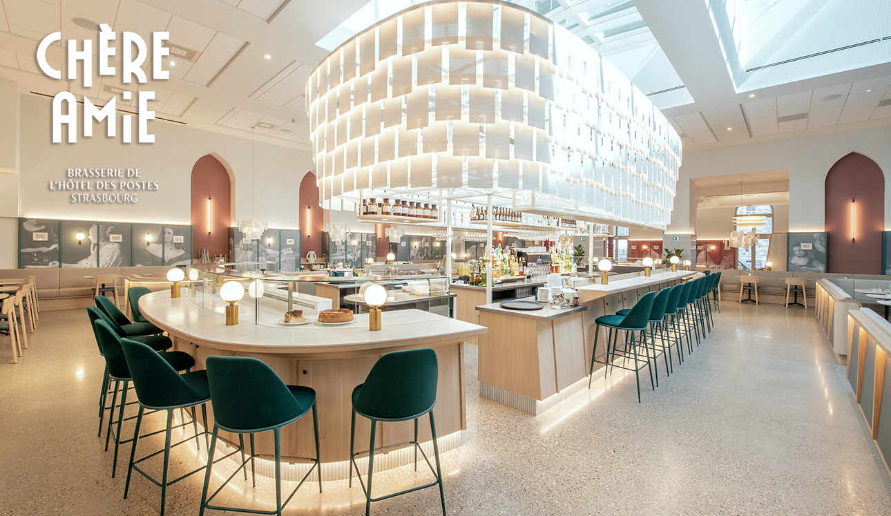 Installée au 5 avenue de la Marseillaise dans le bâtiment historique de l’Hôtel des Postes classé au patrimoine mondial de l’Unesco, la brasserie Chère Amie investit avec élégance le quartier emblématique de la Neustadt. L’univers du lieu s’inspire subtilement du passé postal strasbourgeois avec une esthétique raffinée mêlant codes contemporains et classiques, tout en préservant au maximum les rares éléments patrimoniaux présents sur le site. L’architecture exceptionnelle dialogue harmonieusement avec un design soigné, créant une atmosphère unique propice aux événements professionnels mémorables. La salle côté cour de l’Hôtel des Postes révèle le charme authentique du bâtiment historique. Le quartier de la Neustadt dévoile son urbanisme impérial allemand remarquable avec la place de la République, le Palais du Rhin et l’Université à proximité. L’établissement propose trois espaces modulables totalisant 600 m², accueillant jusqu’à 320 personnes.